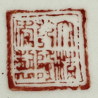 A colorful porcelain plate from the Qing Dynasty that shows hand-painted roosters in a garden setting with insects and flowering plants. The rim features pink, yellow, and blue medallions . Further accompanied by a red Chinese seal mark (chop) on the back, which is probably the signature of the maker or artist. This famille rose piece is a prime example of Chinese artistry from the 18th and 19th centuries.