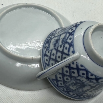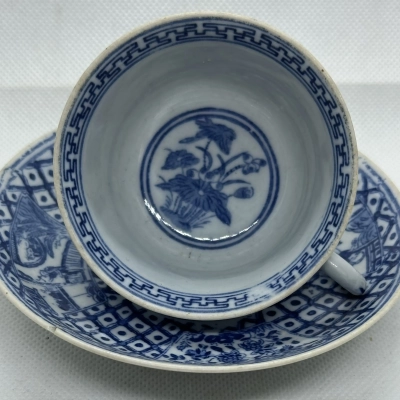 A Chinese export porcelain tea set (cup and saucer) from the Qing Dynasty that has geometric diaper patterns and elaborate cobalt-blue scholar vignettes. Three literati scenes are framed by the medallion in the center of the saucer, which shows birds surrounded by flowers. The exterior of the cup carries on the figural motifs with a Greek key rim. These pair, which have thin walls and exquisite potting, are prime examples of elite porcelain made for European collectors in the 18th and 19th centuries. Perfect for those who appreciate Sino-Western trade artistry