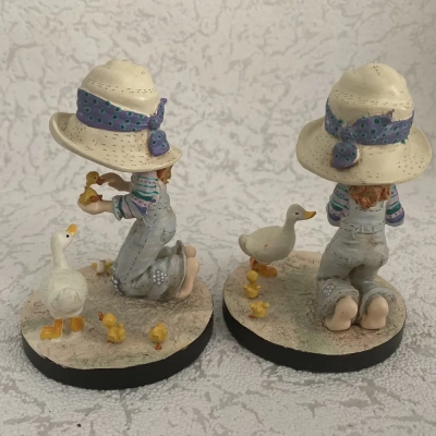 Two identical collectible figurines from the “Sarah Kay” collection, titled “The Girl with the Ducks.”