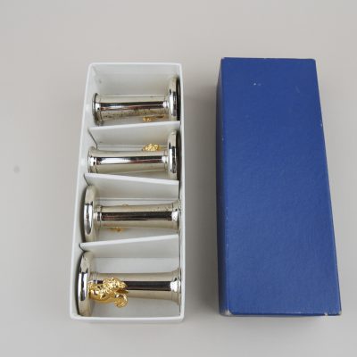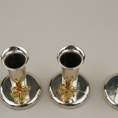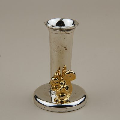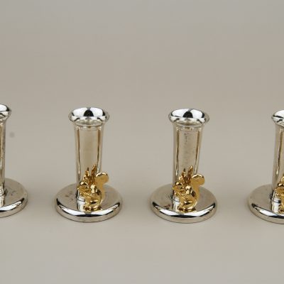 Lovely set of 4 silver and gold plated tableware pieces may be used as candle holders or single flower vases. Silverplate base with gilt attached squirrels, very cute addition to decorate your dinner table.