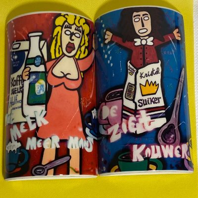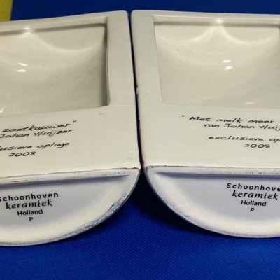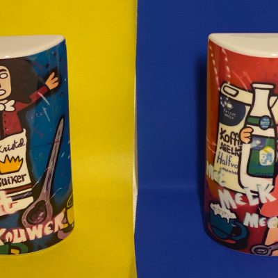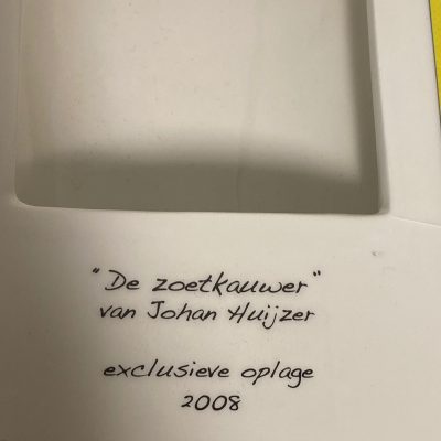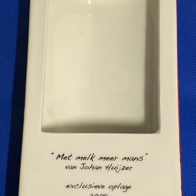 This set is made of artistic porcelain by Johan Huijzer. It was produced by Schoonhoven Ceramics as an exclusive edition in 2008. The titles of the pieces are: “The Sweet Chewer” and “With Milk, More Manly.”