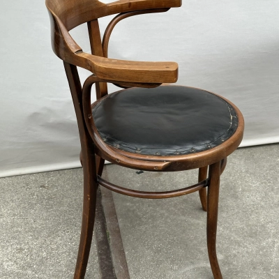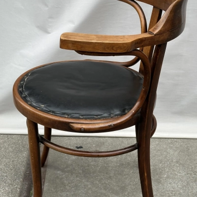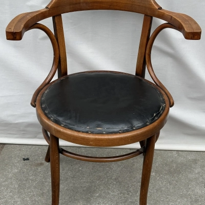 With its recognizable steam-bent beechwood curves, this classic bentwood armchair blends form and function, drawing inspiration from Michael Thonet’s groundbreaking 19th-century design. The circular black leather seat sits on splayed legs that are secured by a stabilizing ring, while the elegantly arched backrest flows into slim armrests. Thonet was a pioneer of mass-produced furniture because of its democratic elegance, which is embodied in the warm honey-toned wood grain and minimalist silhouette that evokes the charm of a Viennese coffeehouse.