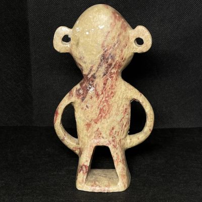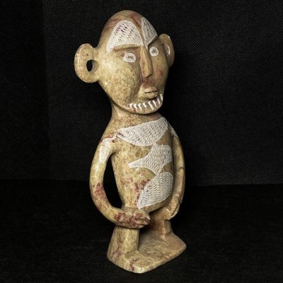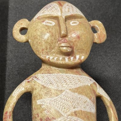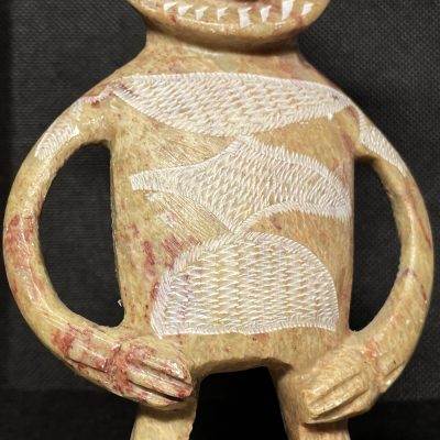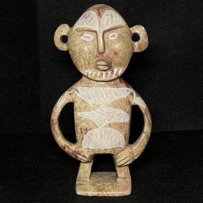 This is a stylized stone carving of a human figure, probably inspired by some kind of tribal or indigenous art. The figure has large, circular ears, almond-shaped eyes, and a nose that is quite prominent. Its body is rectangular, with curved arms resting on the hips and legs fused into a solid base for stability. It features white geometric patterns on the face and chest, lending contrast to the earth tone of the stone. The overall design suggests it may be a ceremonial or decorative piece, reflecting cultural craftsmanship and traditional artistry.