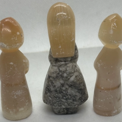 Three delicately carved Russian selenite carvings from the middle of the 20th century that show girls wearing traditional folk dresses, with a focus on flowing skirts and stylized folds rather than fine details. In contrast to the milky translucence of the selenite, one figure has a dress made of marbled stone, possibly inlaid onyx or agate. The craftsmanship captures rustic charm despite the faces being barely defined.