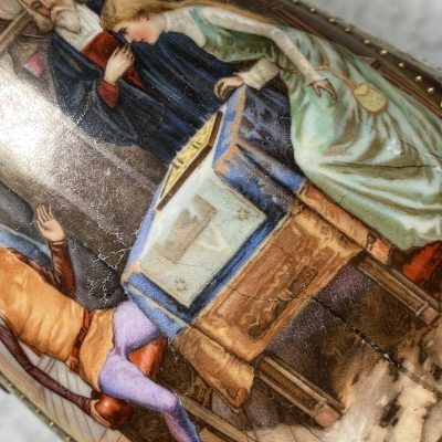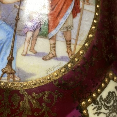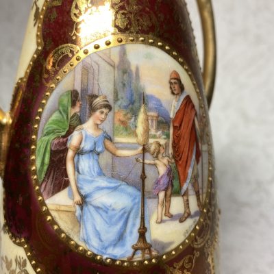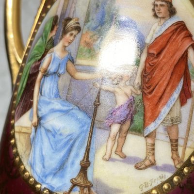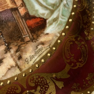 One vase shows La Partita a Scacchi (The Chess Game) by Gerolamo Induno-a quiet moment of strategy and intellectual exchange. The other features Helena and Paris by Giovanni Battista Tiepolo, a romantic and mythological scene brought to life with delicate detail.
