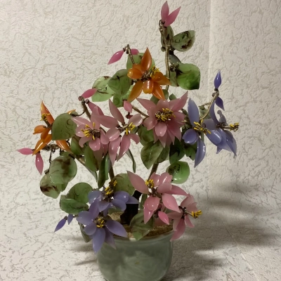 A gorgeous Chinese jade bonsai tree from the Victorian era, with exquisitely detailed and artistically arranged jade flowers and leaves that are delicately hand-carved. The tree’s elegance and classic appeal are enhanced by its placement in a circular celadon ceramic planter. This piece is the ideal addition to any antique or Asian-inspired decor because it perfectly embodies the harmony of nature and craftsmanship.