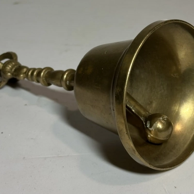 An antique solid brass bell with a handle shaped like a queen’s head and a royal design. The bell exhibits exquisite craftsmanship with a timeless appeal, is fully functional, and produces a clear, mid-pitched sound.