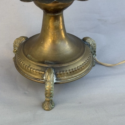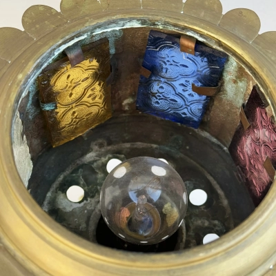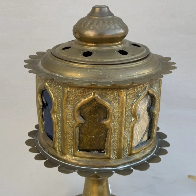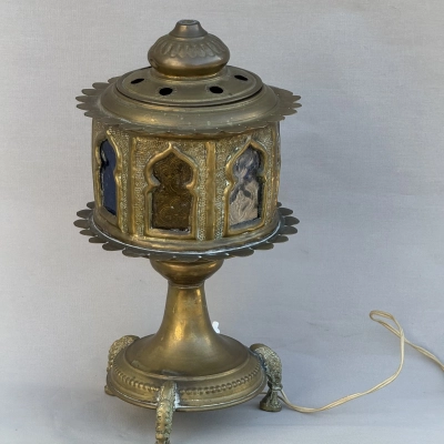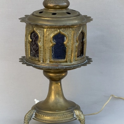 A Moroccan brass table lamp from the late 19th century with elaborate ogee arches, colored glass inserts, and geometric embossed patterns. Crowned by a starburst rim and scalloped domed top, the cylindrical body rests on a pedestal base with claw feet and beaded trim, characteristics of Orientalist fascination from the Victorian era. Its warm patina and Moorish craftsmanship, when converted to electric use (cord visible), evoke the charm of caravanserais in North Africa. Perfect for infusing studies, lounges, or interiors with a global theme with exotic elegance.