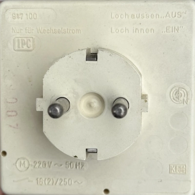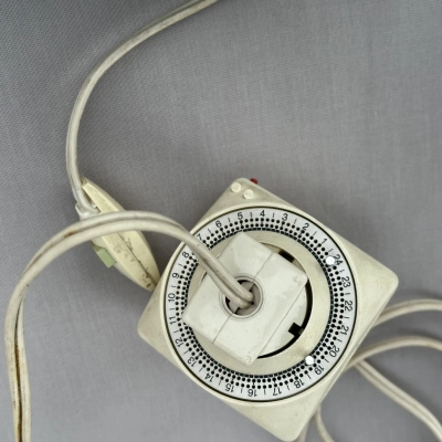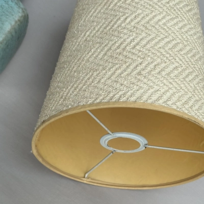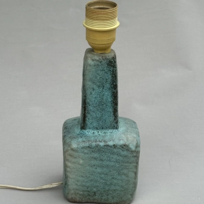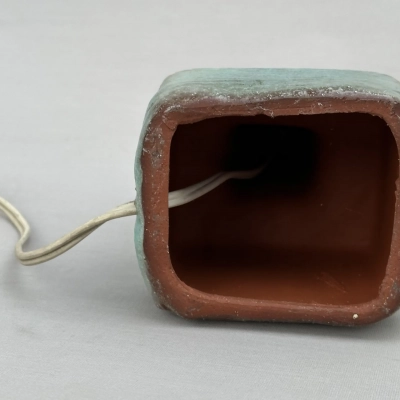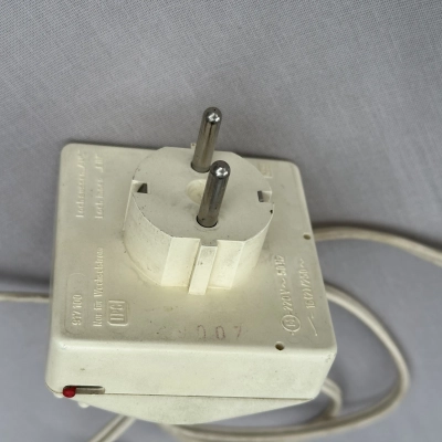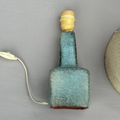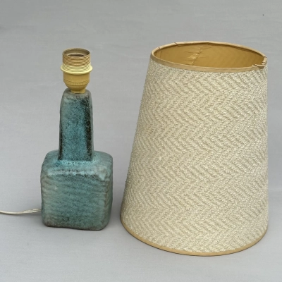 A striking European table lamp from the 1970s that combines technical inventiveness with modernist design. A built-in “JOPO mechanical timer” with a 24-hour dial and a “German AC socket” (Model 917 100, 220V ~ 50Hz) marked for alternating current are housed in the colorful turquoise ceramic base, which is glazed with an organic texture. Warm light is cast by its functional artistry, which is topped with a cream woven shade (a diagonal weave with gold trimmings). It is completely functional and free of cracks and wiring problems. Ideal for collectors of mid-century innovation or eclectic interiors.