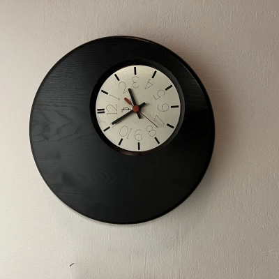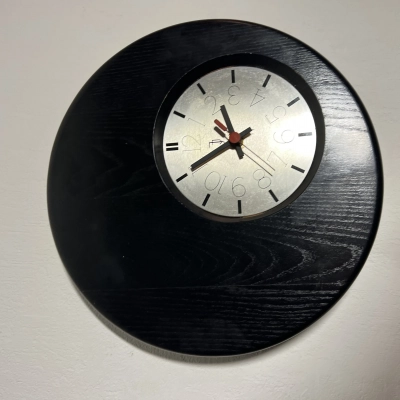 Mid-century vintage wall clock by JJ = Jacob Jensen. 70s, minimalist. Modern design black wood and silver colored dial. Logo JJ, Danish brand. Works on battery,EMES GERMANY,  german manufacturer.